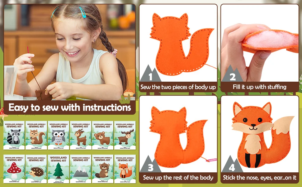 مجموعة من 12 قطعة من اللباد المقطوع مسبقًا لخياطة الحرف اليدوية على شكل حيوان من مخلوقات الغابة المحشوة للأطفال، أفضل هدية تعليمية