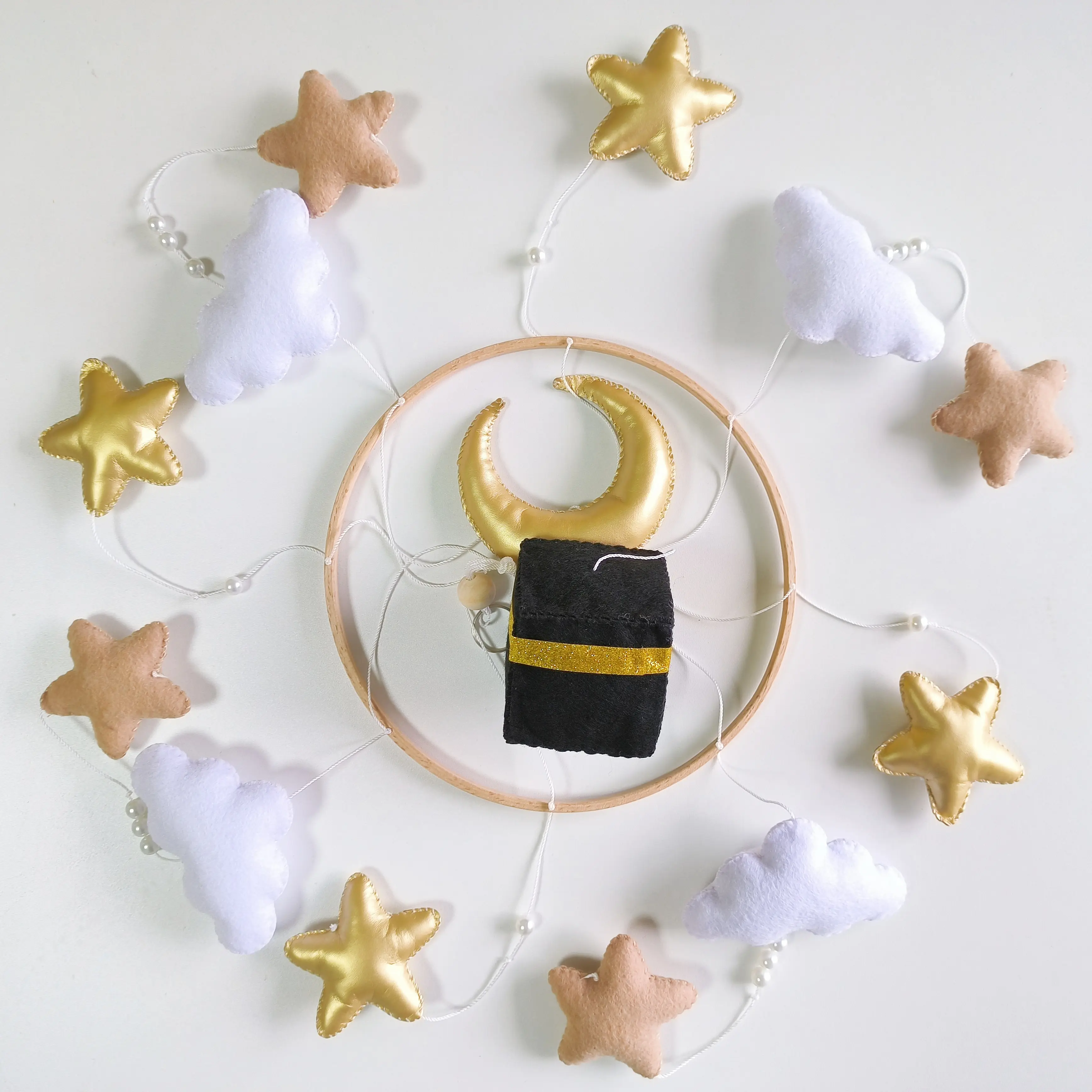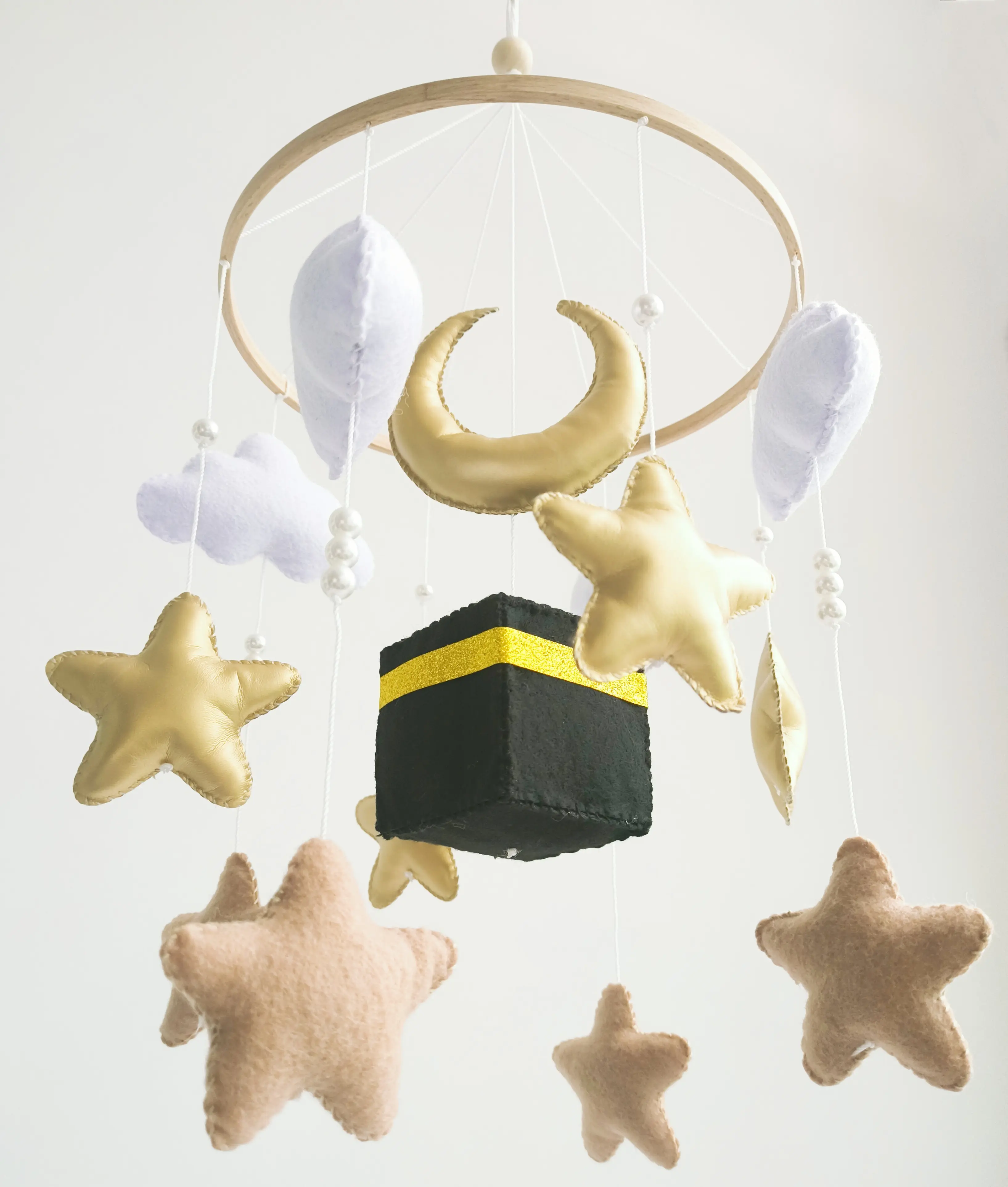 سرير أطفال من اللباد بتصميم بوهو مع مكعب قرآني إسلامي على شكل الكعبة، سرير أطفال متحرك معلق به ألعاب