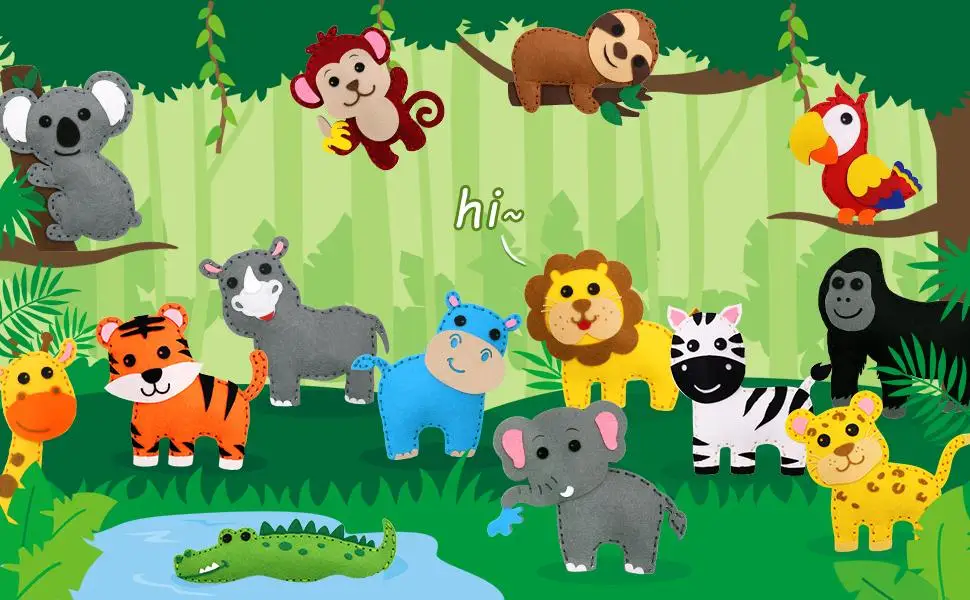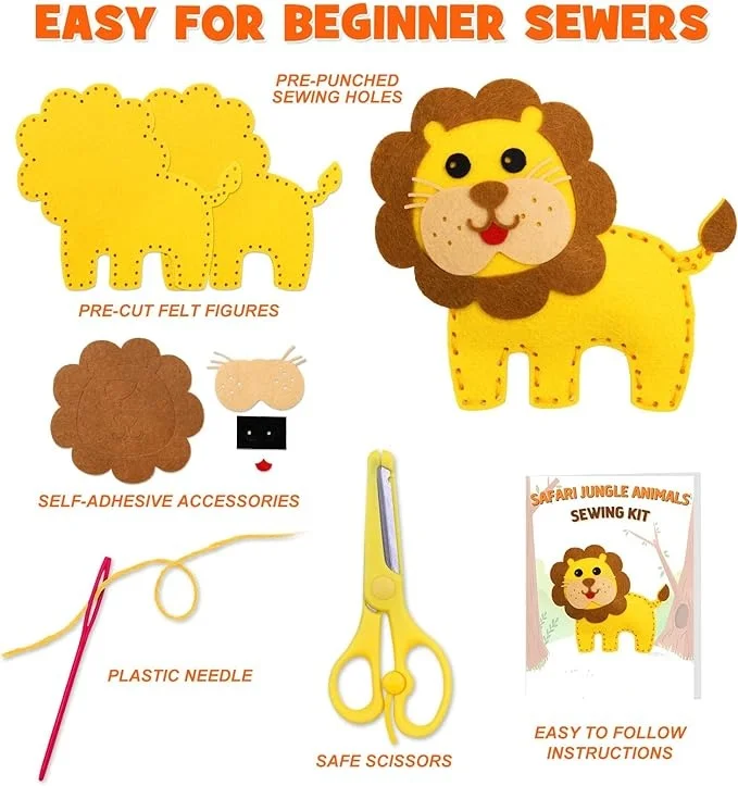 مجموعة خياطة حيوانات الغابة المخصصة للسفاري، مجموعة خياطة حيوانات محشوة، زينة من اللباد، مجموعة خياطة من اللباد، لعبة ناعمة للبنات