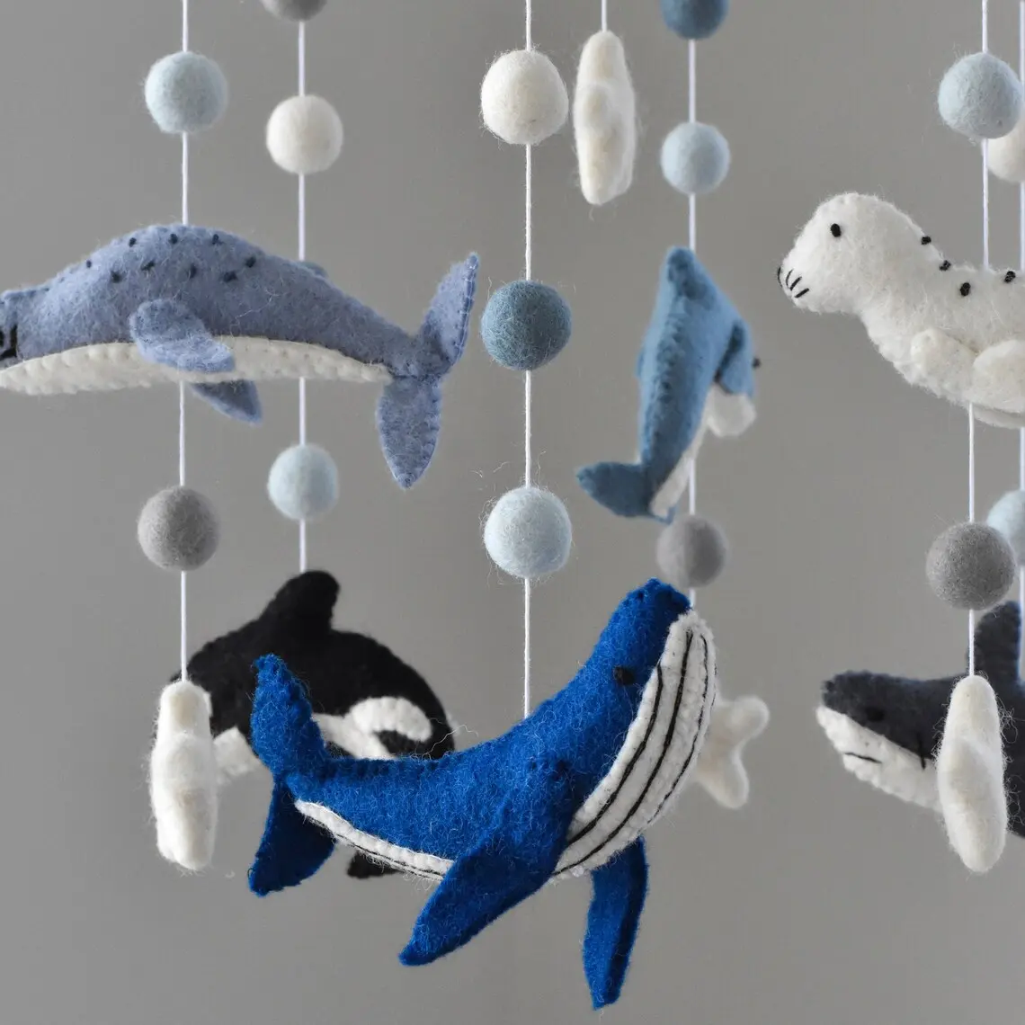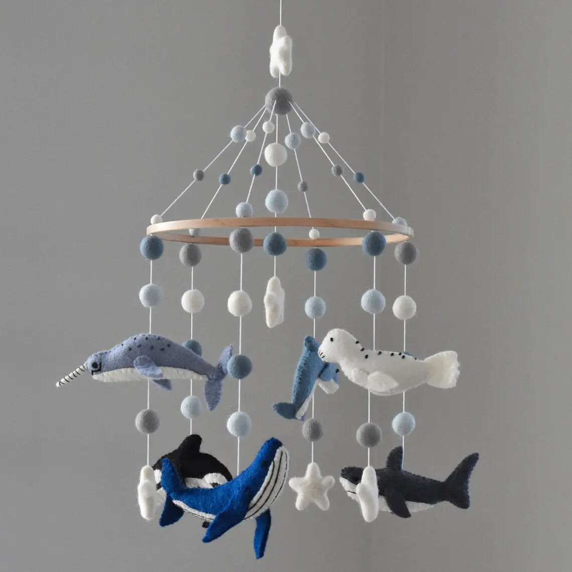 ديكور غرفة الأطفال على شكل فقمة محايدة أو دولفين أو حوت أو حيوانات المحيط أو كرة موسيقية من اللباد أو ألعاب متحركة للأطفال لسرير الطفل