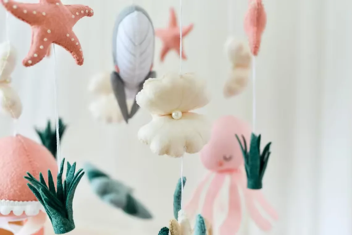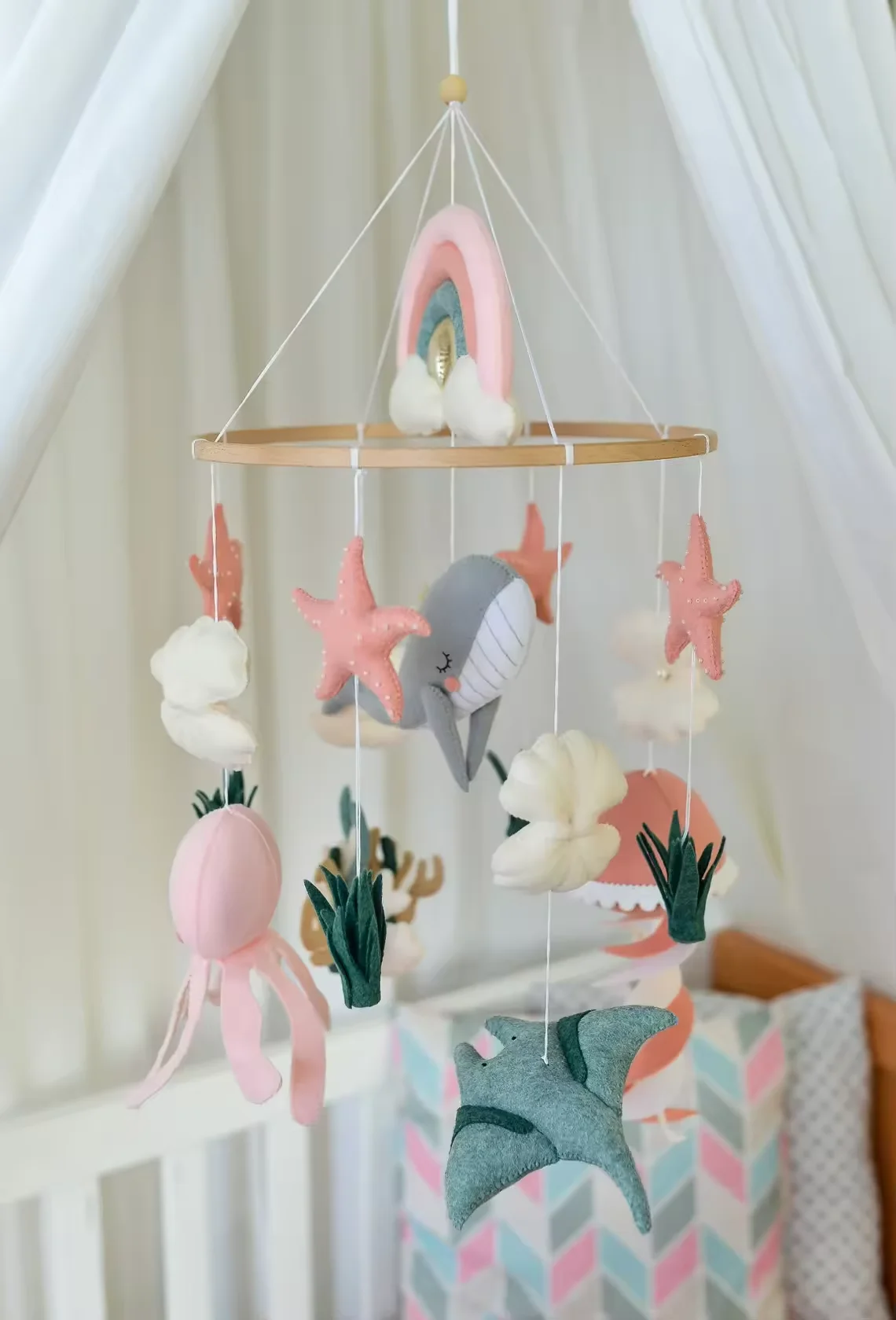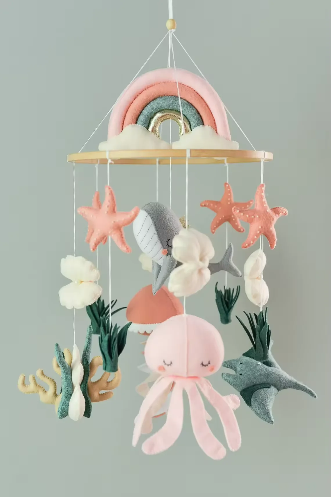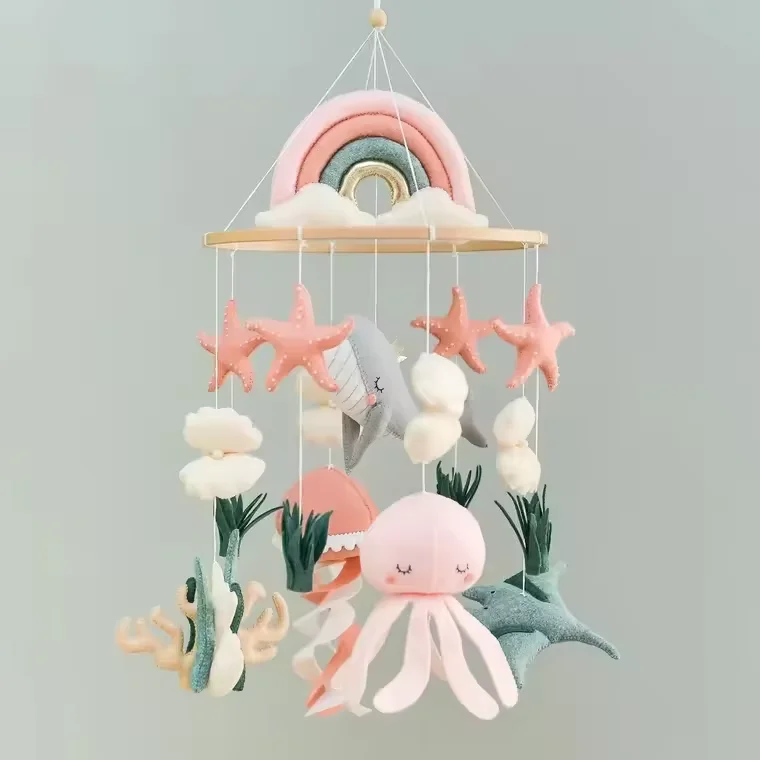 سرير أطفال محمول مخصص للبيع بالجملة على شكل حيوان محيطي حديث الولادة على شكل قوس قزح ونجم البحر وأخطبوط وقنديل البحر وسمكة الراي اللساع وحوت من اللباد كهدية لحفل استقبال المولود